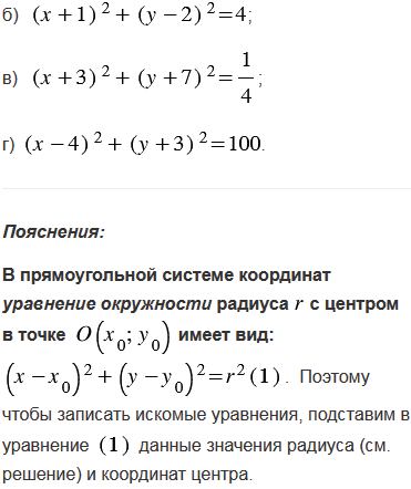 Напишите уравнение окружности радиуса с центром А, если: а) А(0; 5), = 3; б) А(-1; 2), = 2; в) А(-3; -7), = ; г) А(4; -3), = 10.