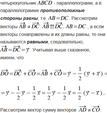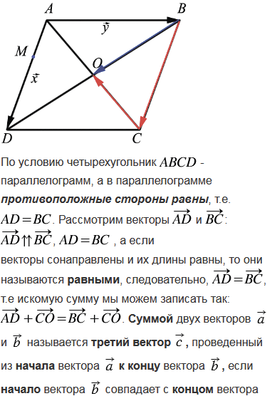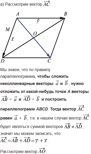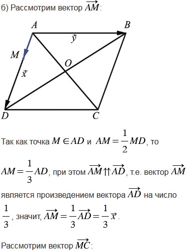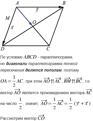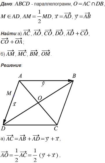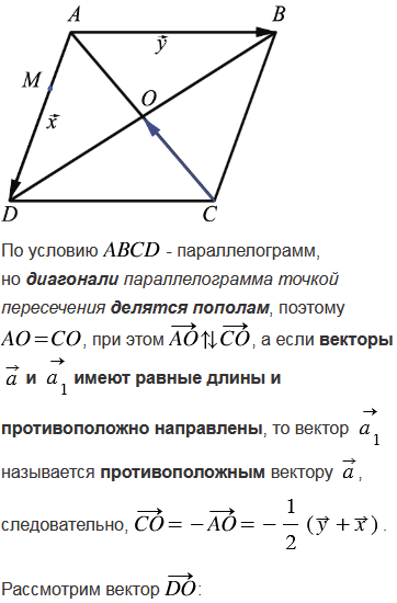 В параллелограмме ABCD диагонали пересекаются в точке О, а М - такая точка на стороне AD, что AM = MD. Выразите через векторы = , = следующие векторы: