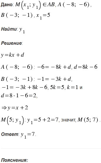 Найдите ординату точки М, лежащей на прямой АВ, если известно, что А(-8; -6), В(-3; -1) и абсцисса точки М равна 5.