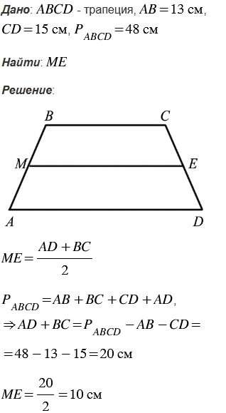 Боковые стороны трапеции равны 13 см и 15 см, а периметр равен 48 см. Найдите среднюю линию трапеции.