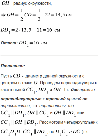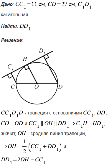 Из концов диаметра CD данной окружности проведены перпендикуляры СС1 и DD1 к касательной не перпендикулярной к диаметру CD. Найдите DD1, если CC1 = 11 см, а CD = 27 см.