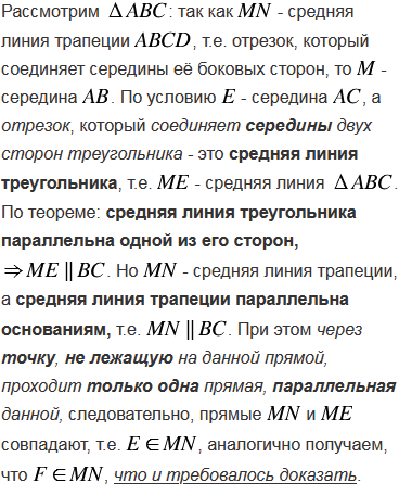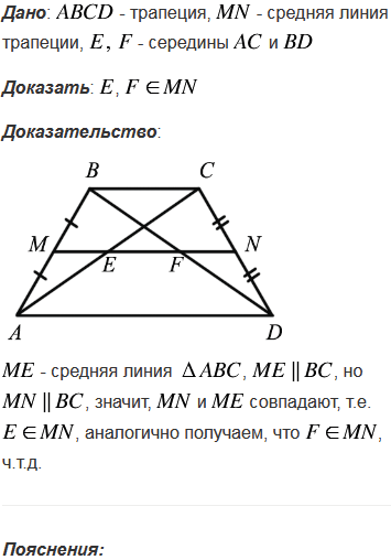 Докажите, что средняя линия трапеции проходит через середины диагоналей.