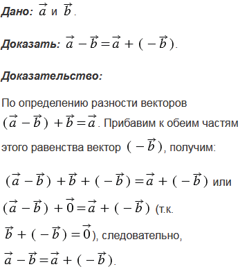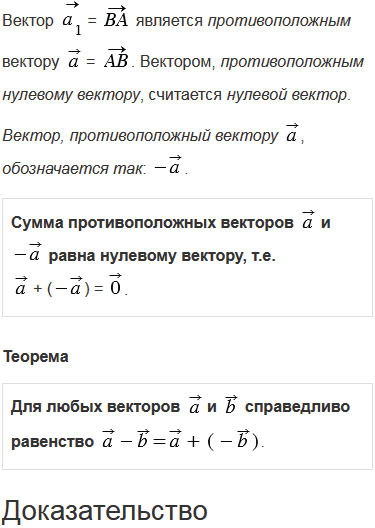 Какой вектор называется противоположным данному. Сформулируйте и докажите теорему о разности векторов.