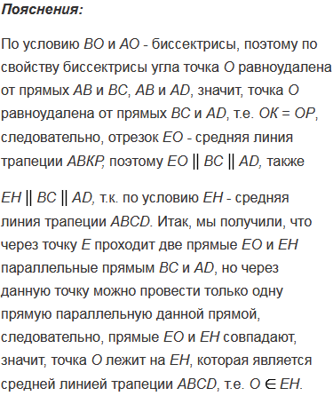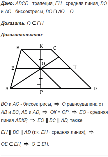 Докажите, что вершина угла, образованного биссектрисами двух углов трапеции, прилежащих к боковой стороне, лежит на прямой, содержащей среднюю линию трапеции.