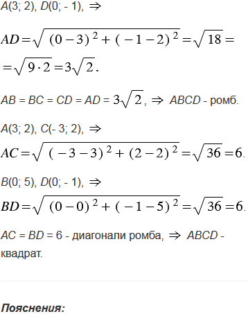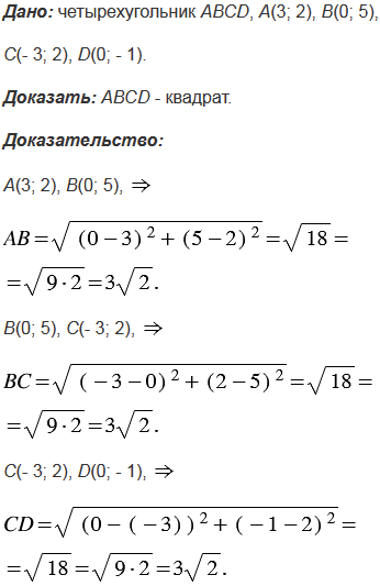 Докажите, что четырехугольник АВСD, вершины которого имеют координаты А(3; 2), В(0; 5), С(- 3; 2), D(0; - 1), является квадратом.