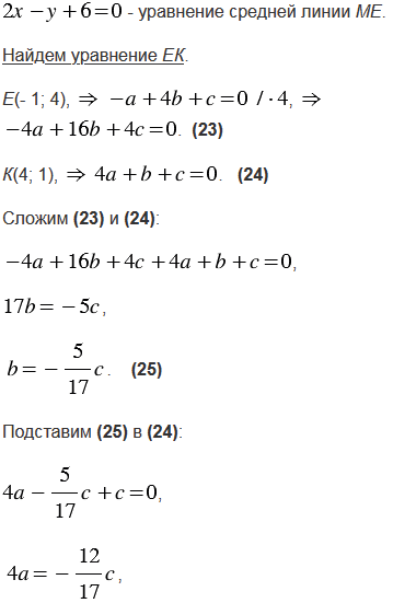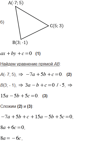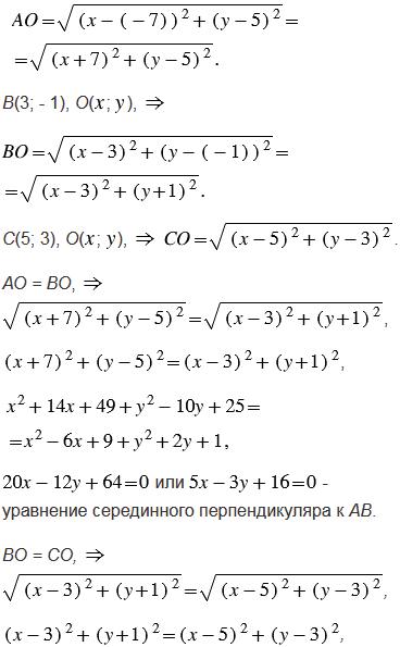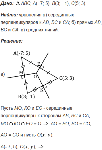 Вершины треугольника АВС имеют координаты А(- 7; 5), В(3; - 1), С(5; 3). Составьте уравнения: а) серединных перпендикуляров к сторонам треугольника; б) прямых АВ, ВС и СА; в) прямых, на которых лежат средние линии треугольника.