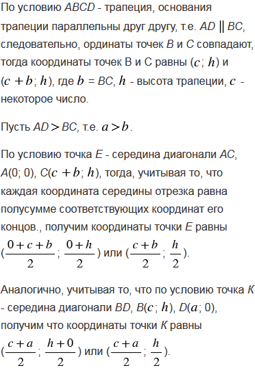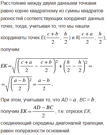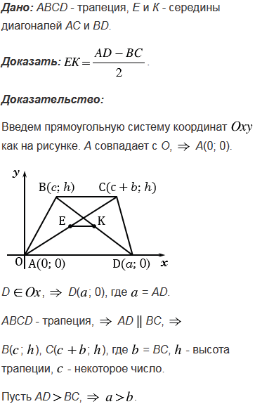 Докажите, что отрезок, соединяющий середины диагоналей трапеции, равен полуразности оснований.
