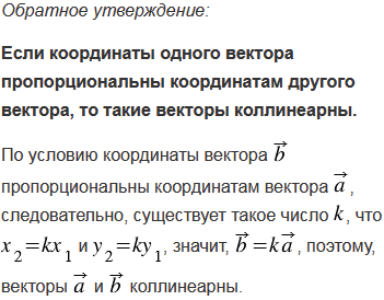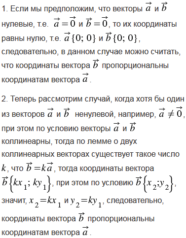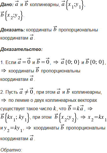Докажите, что если два вектора коллинеарны, то координаты одного вектора пропорциональны координатам другого. Сформулируйте и докажите обратное утверждение.