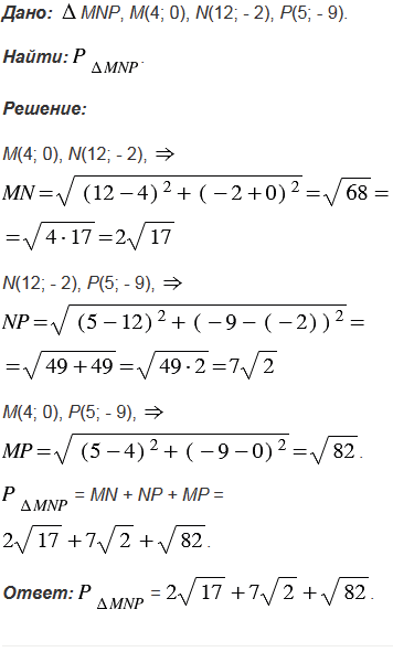 Найдите периметр треугольника МNP, если М(4; 0), N(12; - 2), Р(5; - 9).
