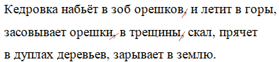 Кедровка набьёт в зоб орешков, и летит в горы, засовывает орешки, в трещины, скал, прячет в дуплах деревьев, зарывает в землю.