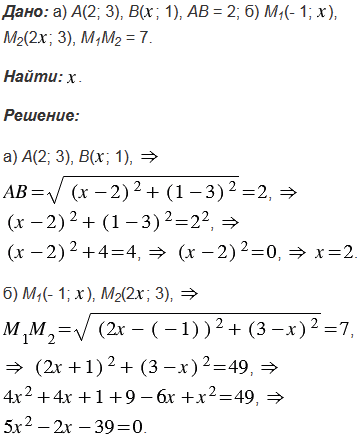 Найдите , если: а) расстояние между точками А(2; 3) и В(; 1) равно 2; б) расстояние между точками М1(- 1; ) и М2(2; 3) равно 7.