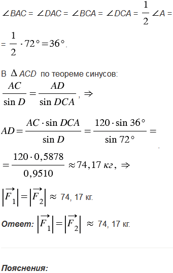 Две равные по величине силы приложены к одной точке под углом 720 друг к другу. Найдите величины этих сил, если величина их равнодействующей равна 120 кг.