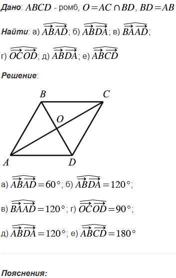 Диагонали ромба ABCD пересекаются в точке О, и диагональ BD равна стороне ромба. Найдите угол между векторами: а)