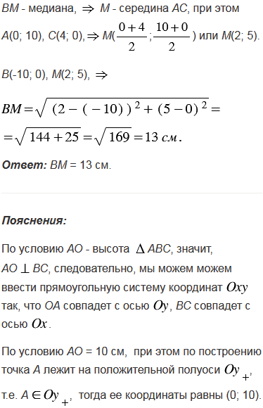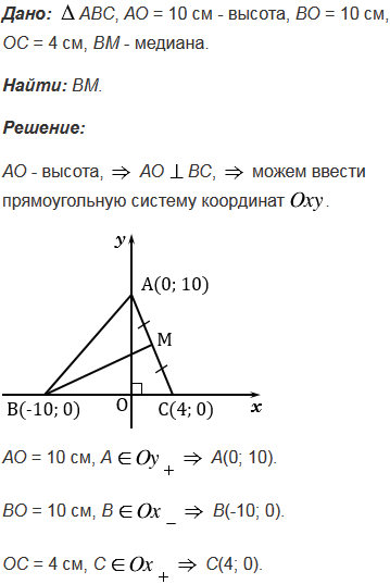 Высота треугольника, равная 10 см, делит основание на два отрезка, равные 10 см и 4 см. Найдите медиану, проведенную к меньшей из двух других сторон.