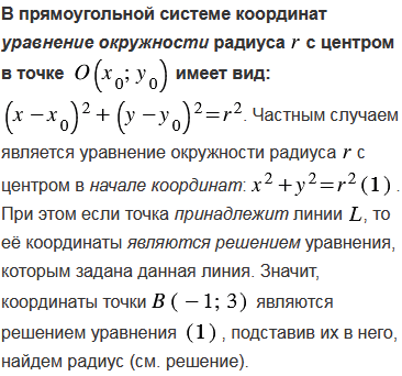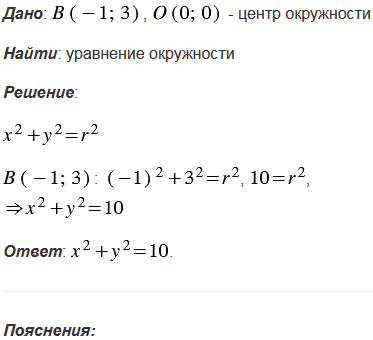 Напишите уравнение окружности с центром в начале координат, проходящей через точку В(-1; 3).
