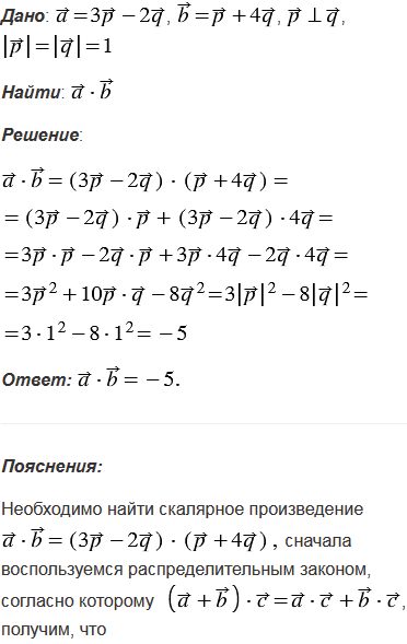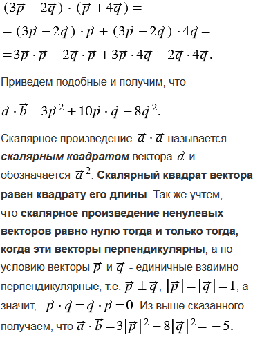 Вычислите скалярное произведение векторов и , если и , где и - единичные взаимно перпендикулярные векторы.