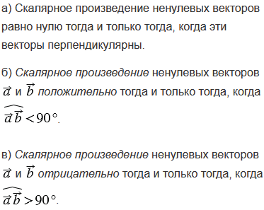 В каком случае скалярное произведение ненулевых векторов: а) равно 0; б) больше 0; в) меньше 0?