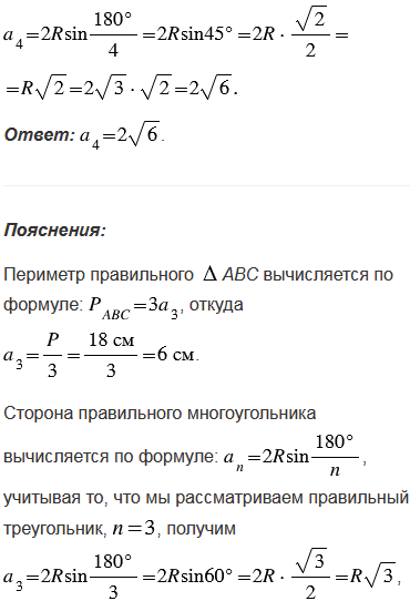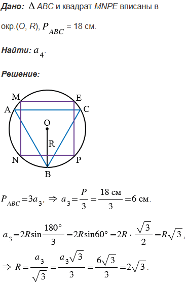 Периметр правильного треугольника вписанного в окружность, равен 18 см. Найдите сторону квадрата, вписанного в ту же окружность.
