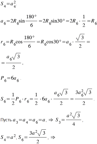 Стороны правильного треугольника, квадрата и правильного шестиугольника равны друг другу. Найдите отношения площадей этих многоугольников.