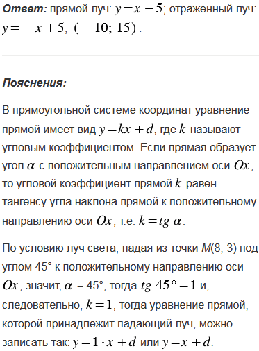 Луч света, падая из точки М(8; 3) под углом 45° к положительному направлению оси , отражается от неё. Составьте уравнения прямых, которым принадлежат падающий и отражённый лучи. В какой точке отражённый луч пересекает экран, находящийся в точке В(–10; 0) и расположенный перпендикулярно к оси ?