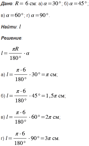 Найдите длину дуги окружности радиуса 6 см, если её градусная мера равна: а) 300; б) 450; в) 600; г) 900.