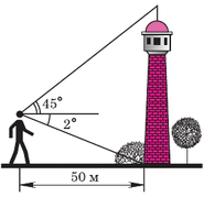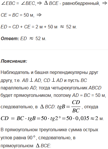 Наблюдатель находится на расстоянии 50 м от башни, высоту которой хочет определить (рис. 334). Основание башни он видит под углом 20 к горизонту, а вершину - под углом 450 к горизонту. Какова высота башни?