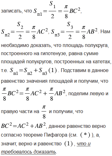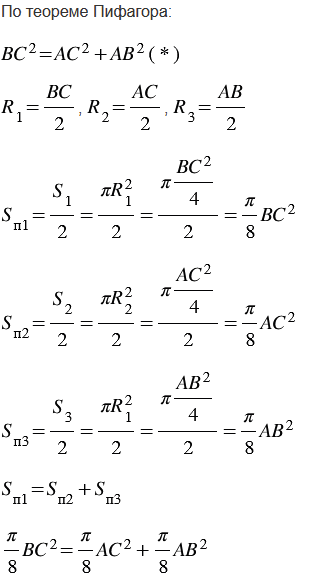 На сторонах прямоугольного треугольника как на диаметрах построены три полукруга. Докажите, что площадь полукруга, построенного на гипотенузе, равна сумме площадей полукругов, построенных на катетах.