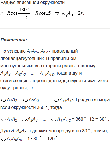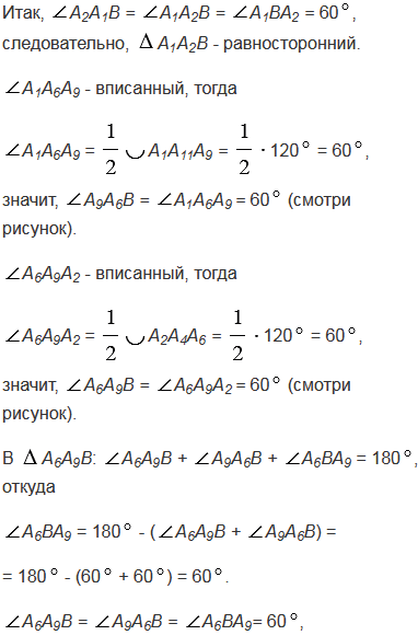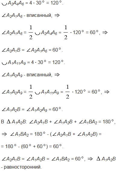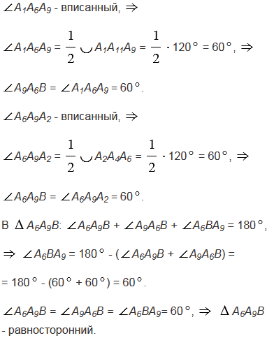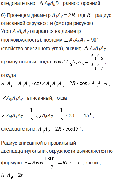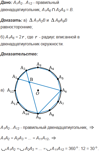 Диагонали А1А6 и А2А9 правильного двенадцатиугольника пересекаются в точке В (рис. 318). Докажите, что: а) треугольники А1А2В и А6А9В равносторонние; б) А1А6 = 2, где - радиус вписанной в двенадцатиугольник окружности.