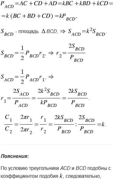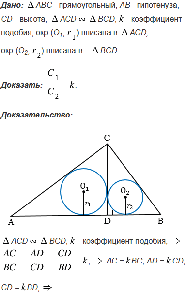 Высота прямоугольного треугольника, проведенная к гипотенузе, разделяет треугольник на два подобных треугольника (см. задачу 2, п. 65). Докажите, что отношение длин окружностей, вписанных в эти треугольники, равно коэффициенту подобия этих треугольников.