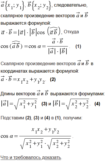 Выведите формулу, выражающую косинус угла между ненулевыми векторами через их координаты.