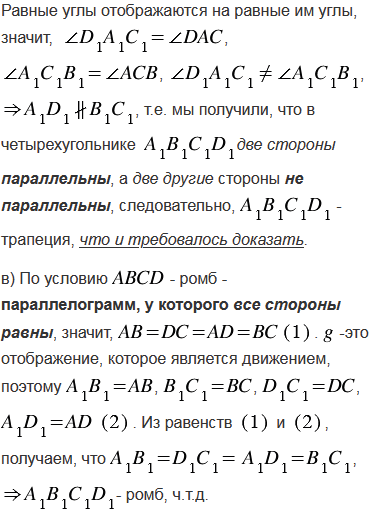Докажите, что при движении: а) параллелограмм отображается на параллелограмм; б) трапеция отображается на трапецию; в) ромб отображается на ромб; г) прямоугольник отображается на прямоугольник, а квадрат - на квадрат.
