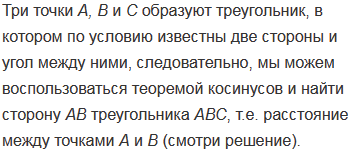 Чтобы определить расстояние между точками А и В, которое нельзя измерить, выбирают третью точку С, из которой видны точка А и В. Измерив угол АСВ и расстояние АС и СВ, находят расстояние АВ. Найдите АВ, если АС =