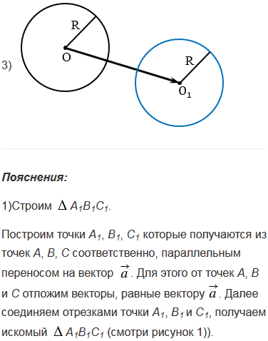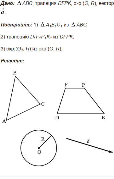 Даны треугольник, трапеция и окружность. Постройте фигуры, которые получаются из этих фигур параллельным переносом на данный вектор