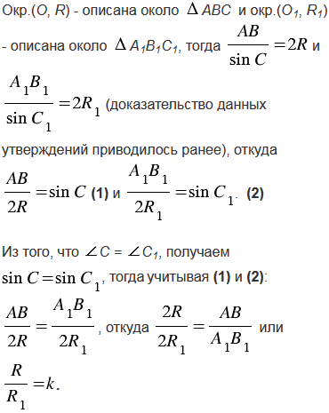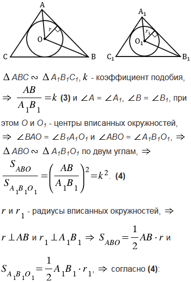 Докажите, что коэффициент подобия двух подобных треугольников равен отношению радиусов окружностей: