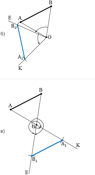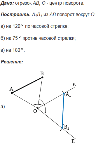 Постройте отрезок А1В1, который получается из данного отрезка АВ поворотом вокруг данного центра О: а) на 1200 по часовой стрелке; б) на 750 против часовой стрелки; в) на 1800.