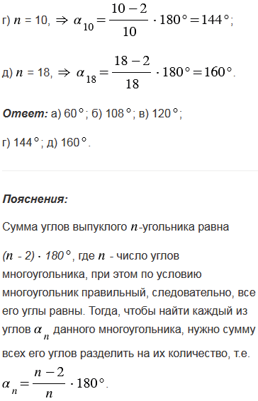 Найдите углы правильного -угольника, если: а) = 3; б) = 5; в) = 6; г) = 10; д) = 18.