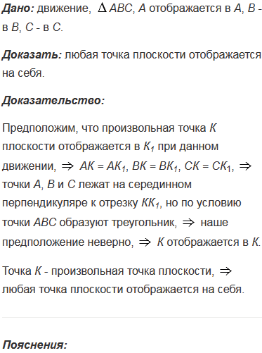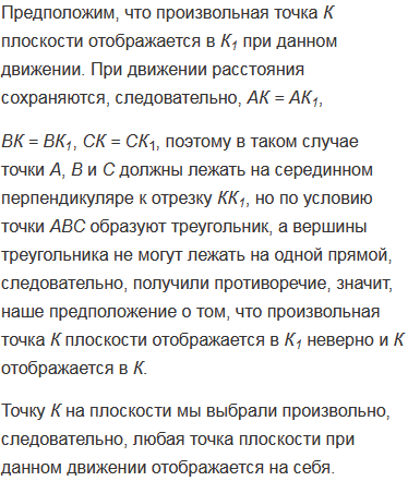 При данном движении каждая из вершин треугольника АВС отображается на себя. Докажите, что любая точка плоскости отображается на себя.