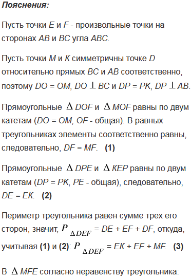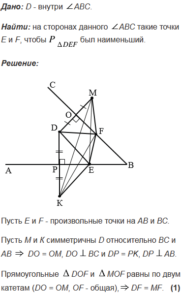 Даны острый угол АВС и точка D внутри него. Используя осевую симметрию, найдите на сторонах данного угла такие точки Е и F, чтобы треугольник DEF имел наименьший периметр.
