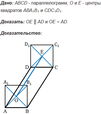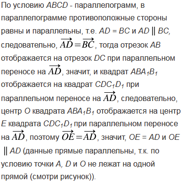 На сторонах АВ и СD параллелограмма АВСD построены квадраты так, как показано на рисунке 332. Используя параллельный перенос, докажите, что отрезок, соединяющий центры этих квадратов, равен и параллелен стороне АD.