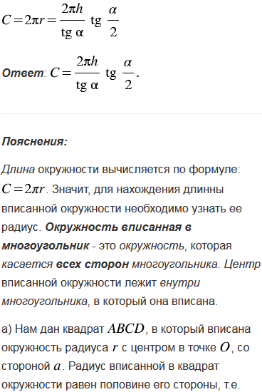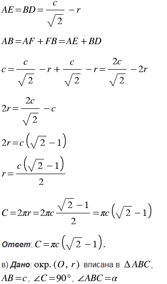 Найдите длину окружности, вписанной: а) в квадрат со стороной ; б) в равнобедренный прямоугольный треугольник с гипотенузой ; в) в прямоугольный треугольник с гипотенузой и острым углом ; г) в равнобедренный треугольник с углом при основании и высотой , проведённой к основанию.