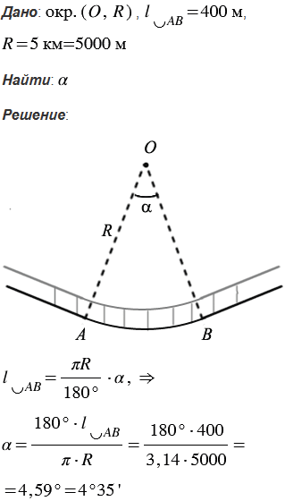 Радиус закругления пути железнодорожного полотна равен 5 км, а длина дуги закругления - 400 м. Какова градусная мера дуги закругления?