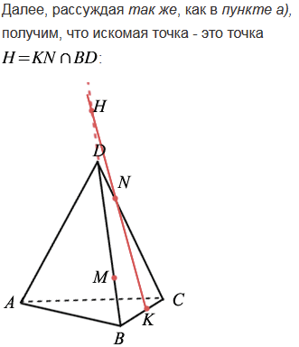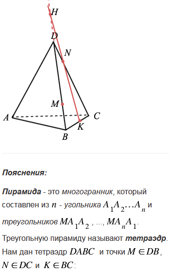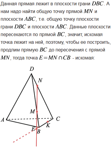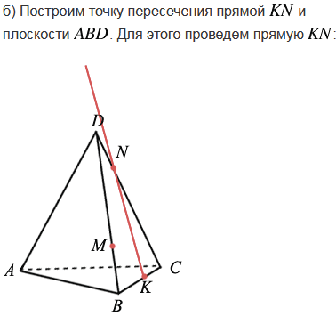 Изобразите тетраэдр DABC и на рёбрах DB, DC и ВС отметьте соответственно точки M, N и K. Постройте точку пересечения: а) прямой MN и плоскости АВС; б) прямой KN и плоскости ABD.