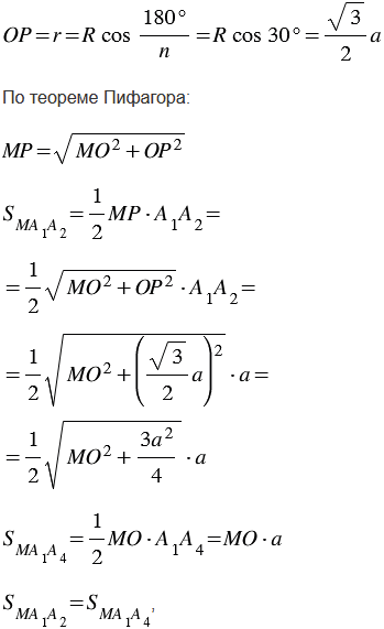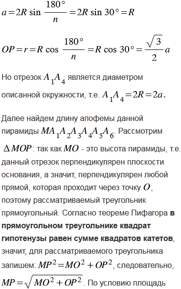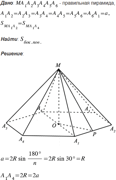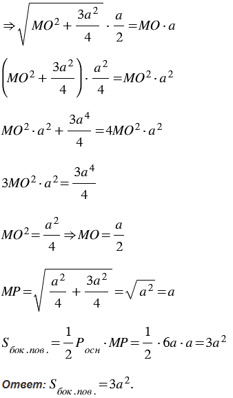 Найдите площадь боковой поверхности правильной шестиугольной пирамиды, если сторона её основания равна