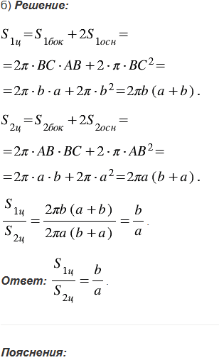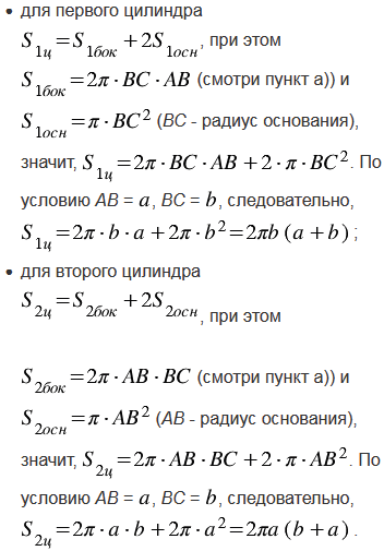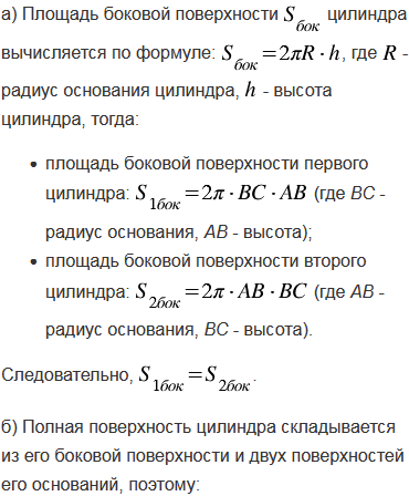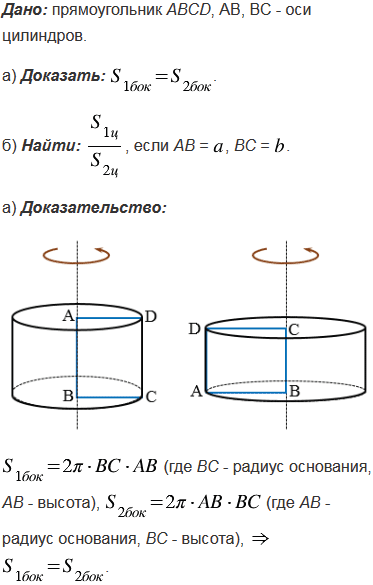 Один цилиндр получен вращением прямоугольника АВСD вокруг прямой АВ, а другой цилиндр - вращением этого же прямоугольника вокруг прямой ВС. а) Докажите, что площади боковых поверхностей этих цилиндров равны. б) Найдите отношение площадей полных поверхностей этих цилиндров, если АВ = , ВС = .