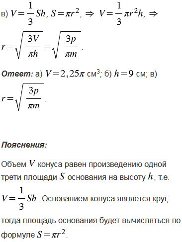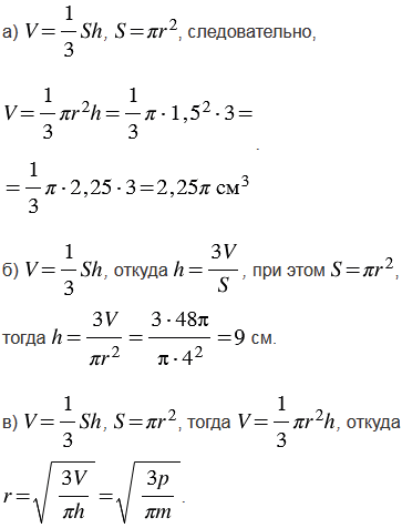 Пусть h, r и V - соответственно высота, радиус основания и объем конуса. Найдите: а) V, если h = 3 см, r = 1,5 см; б) h, если r = 4 см, V = 48