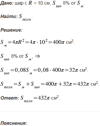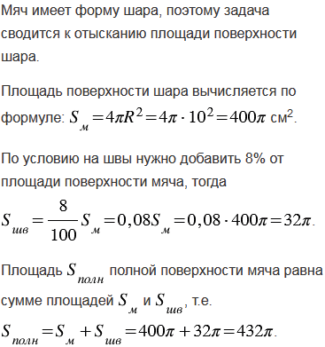 Сколько кожи пойдет на покрышку футбольного мяча радиуса 10 см (на швы добавить 8% от площади поверхности мяча)?