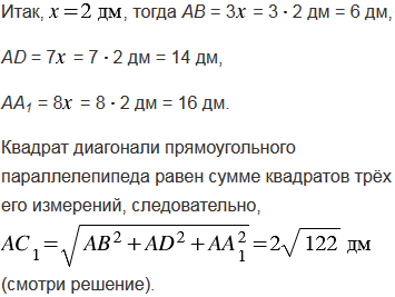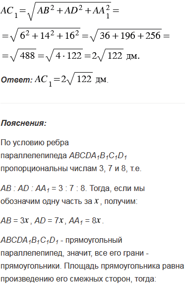 Сумма площадей трех граней прямоугольного параллелепипеда, имеющих общую вершину, равна 404 дм2, а его ребра пропорциональны числам 3, 7 и 8. Найдите диагональ параллелепипеда.