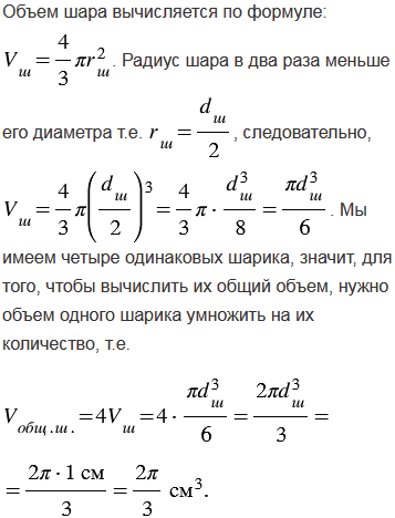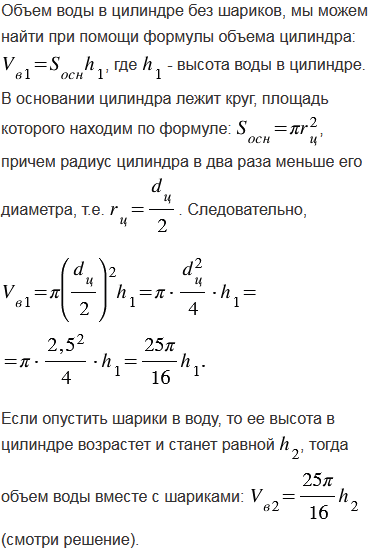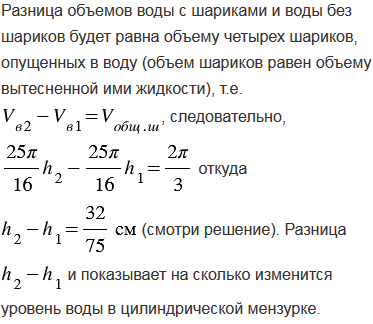 В цилиндрическую мензурку диаметром 2,5 см, наполненную водой до некоторого уровня, опускают 4 равных металлических шарика диаметром 1 см. На сколько изменится уровень воды в мензурке?