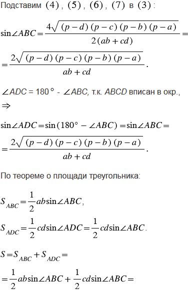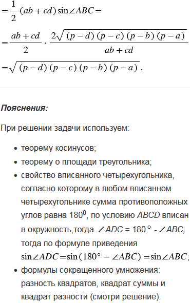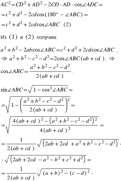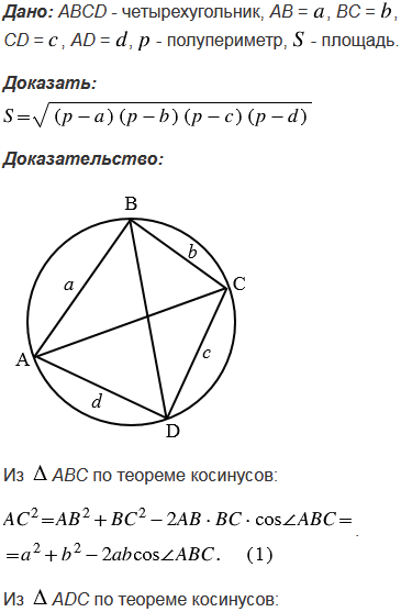 Докажите, что площадь четырехугольника, вписанного в окружность, может быть вычислена по формуле