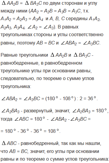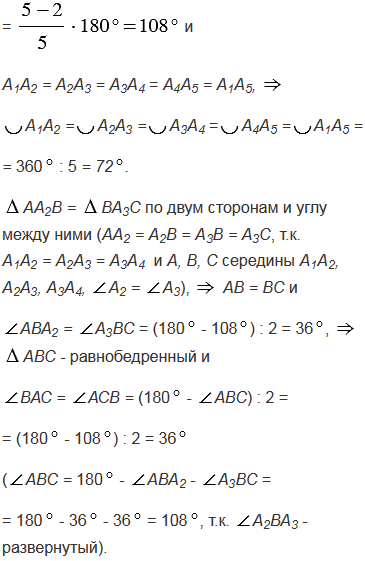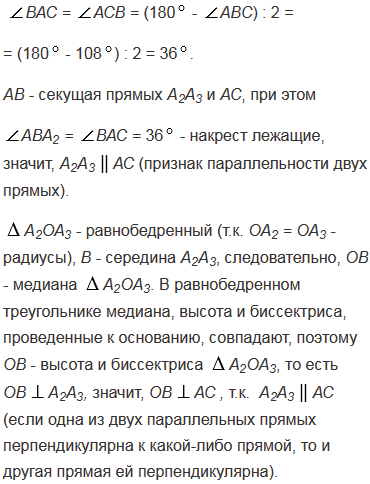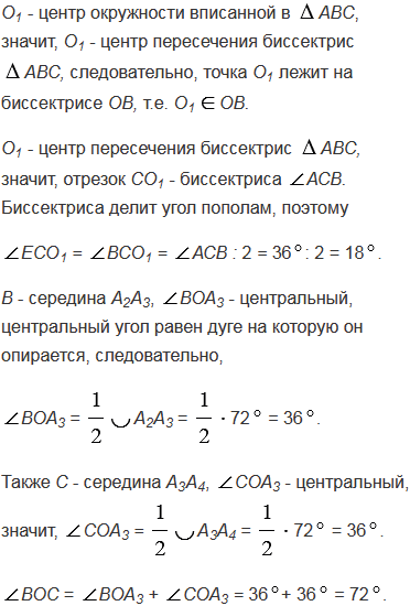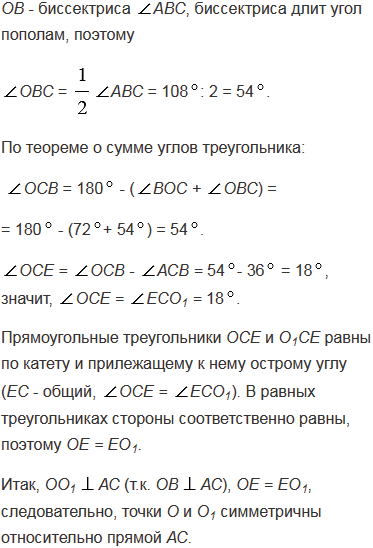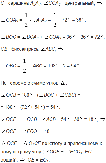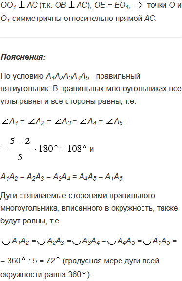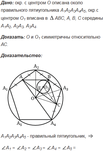 Около правильного пятиугольника А1А2А3А4А5 описана окружность с центром О. Вершинами треугольника АВС являются середины сторон А1А2, А2А3 и А3А4 пятиугольника. Докажите, что центр О данной окружности и центр О1 окружности, вписанной в треугольник АВС, симметричны относительно прямой АС.